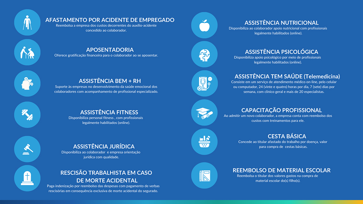 O Seguro Bem-Estar Integral oferece mais de 20 benefícios para a empresa e o colaborador. É importante saber se você é beneficiado com a categoria Ouro ou Diamante, pois as assistências podem variar. Confira algumas: