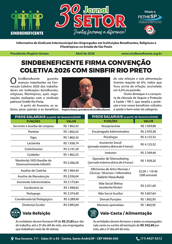 Os trabalhadores podem acessar a edição de abril do Jornal Terceiro Setor, que traz todas as informações completas sobre o reajuste salarial 2026, benefícios e direitos garantidos na nova convenção.