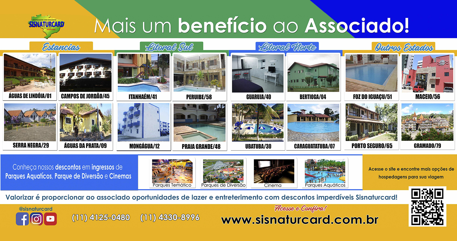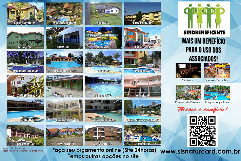 O SindBeneficente possui convênio com a Sisnaturcard, um clube de benefícios que oferece descontos em hospedagens e outras atrações recreativas, exclusivamente para os associados ao sindicato. São oferecidos descontos em hotéis, pousadas, colônias e chalés localizados em estâncias, cidades do litoral paulista (norte e sul) e até em outros estados. A parceria também oferece preços promocionais em ingressos de cinemas e parques de diversões. Para fazer sua reserva, acesse o site www.sisnaturcard.com.br e clique no menu “orçamento”. Preencha todos os campos solicitados e leia atentamente o regulamento na página www.sisnaturcard.com.br/regulamento-1.html. A confirmação da reserva será feita em 24 horas. A Sisnaturcard comunicará a reserva e a forma de pagamento. Para mais informações, ligue: (11) 4125-0480 / 4330-8996 (segunda a quinta, das 9h às 16h). Veja algumas opções de destinos:
